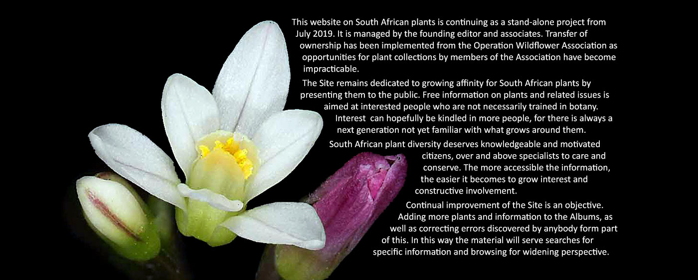 There is an Album for every South African plant genus represented by at least 12 posts on the Site. The Albums and posts are alphabetically arranged using botanical names. Each post or Album Item consists of a picture with text. Genera for which the number of pictures posted is smaller than 12 are grouped together in the Types Albums.