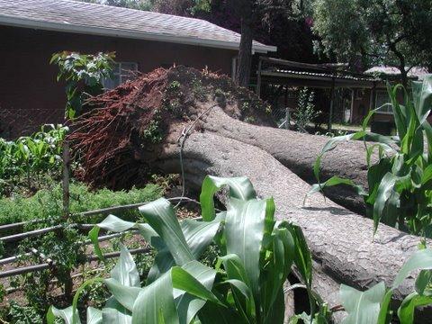 A big tree used to grow immediately next to the aloe that fell on that Friday (the 20th, not the 13th). This tree had caused the aloe to grow slightly to one side, so that the aloe hung slightly skew after the tree had been removed some time before. The deviation from the perpendicular, much rain, cultivated vegetable garden soil and probably some wind, all contributed to bring down the aloe, a beast of specimen, probably over 12, maybe 14 metres in height. It fell across the maize, spinach and other vegetables in the neat garden, hitting the roof edge and reed hedge on the opposite side, so that a curtain of aloe pieces, several of them more than 2 metres in length, was still hanging from the wall by the next Monday.
