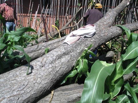 A couple of Operation Wildflower members were invited urgently to help remove the wrecked plant in manageable installments from the site for the vegetable crop (and some aloe) to be saved. The higher branches and some leaf rosettes had already broken off during the fall or could easily be sawn off. The thicker branches took more effort and care to prevent injury to the workers through secondary accidents: pieces thicker than 30 cm and cut in longer than meter lengths easily exceeded 200 kg, requiring two strong men for carrying. And that was just over halfway down to the big end where the root base was over two metres in diameter!